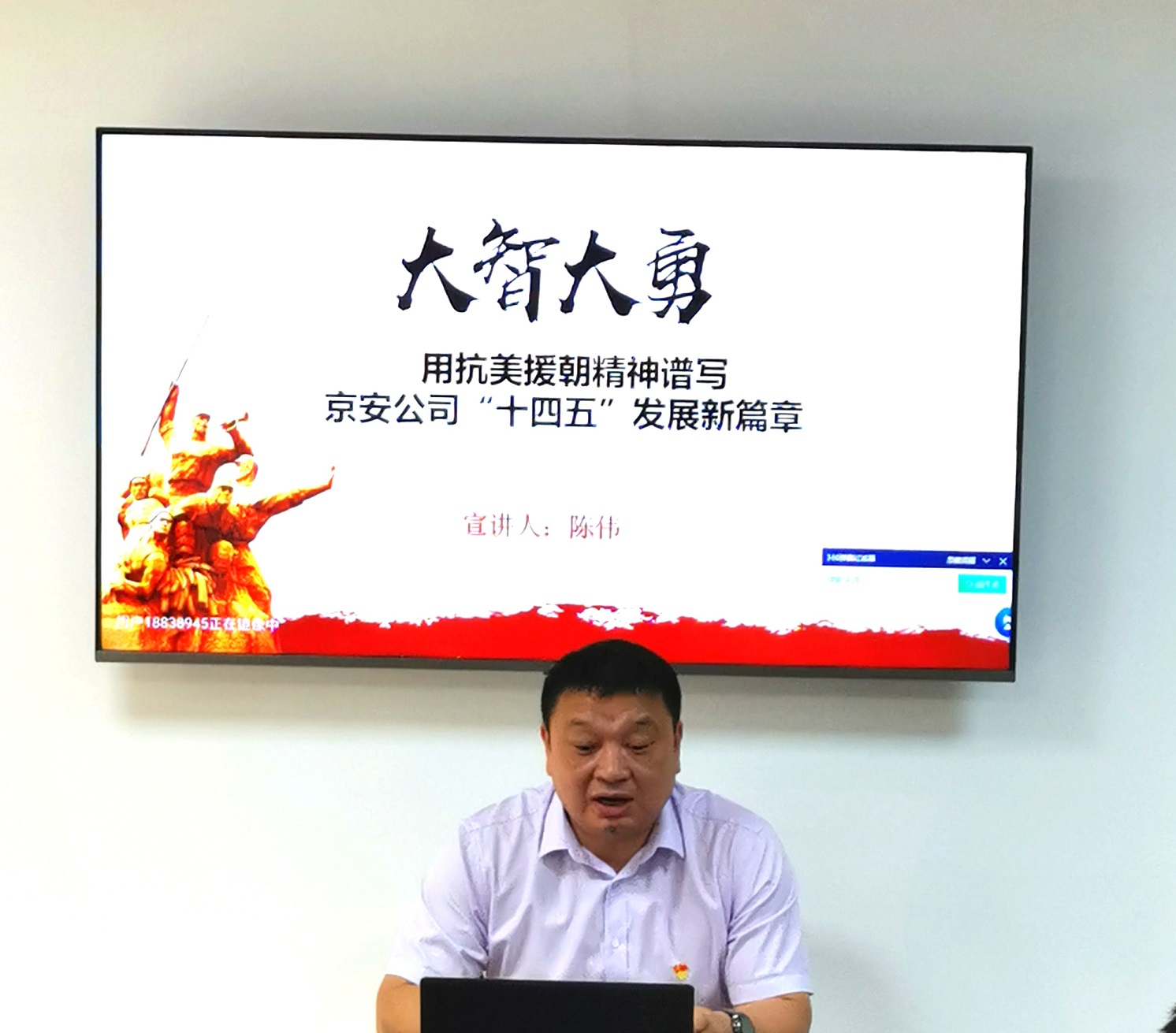 陳偉同志在題為《大智大勇 用抗美援朝精神譜寫京安公司“十四五”發(fā)展新篇章》的黨課中,回顧了上世紀(jì)50年代中國人民志愿軍在客觀條件十分艱苦的情況下,不畏強敵、藐視困難,大智大勇,奪取勝利的偉大歷史。提出“大智大勇、敢于勝利”不僅是志愿軍的軍魂,同樣也應(yīng)該是京安的企業(yè)之魂,要用這種精氣神去克服前進(jìn)中的困難挑戰(zhàn),奮力完成年度重點工作。