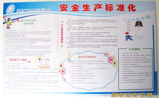 在物產民爆總公司的統一部署下,公司自2013年年中著手開展安全生產標準化創建工作,廣泛進行安全生產標準化創建宣傳教育。2013年6月9日,公司成立了以總經理為組長的安全生產標準化創建領導小組,明確了相關人員的工作職責,以文件形式下發給部門、車間,并在安全生產標準化創建全員會議上予以宣貫。